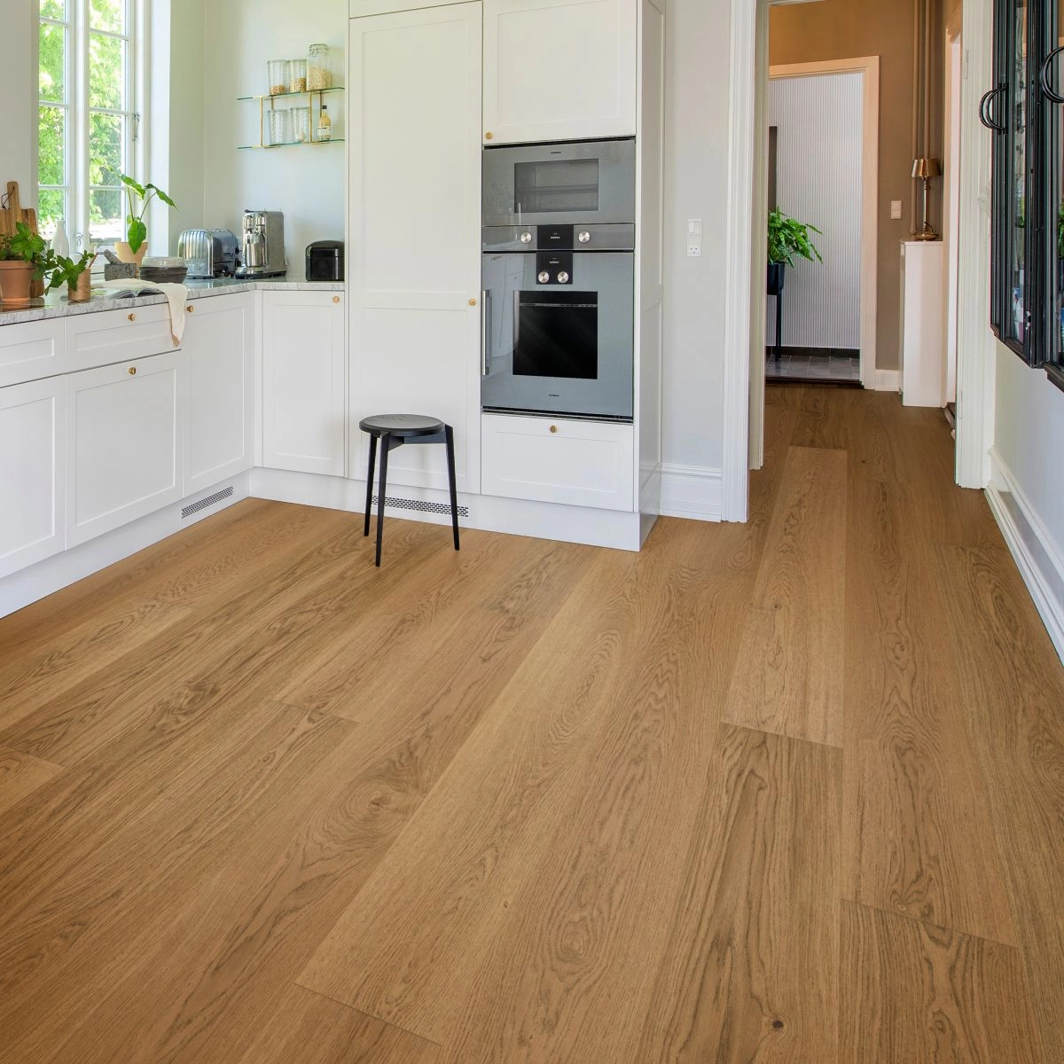 Tullstorp is a luxurious hardened wood floor. The warm Terra Brown shade has been paired with the Nature grading, providing a natural color variation. Made from FSC-certified European oak, the brushed finish provides a natural wood feel – similar to oiled floors – but the finish makes the floors easier to clean and maintain. We recommend a brushed finish in all areas of the home.