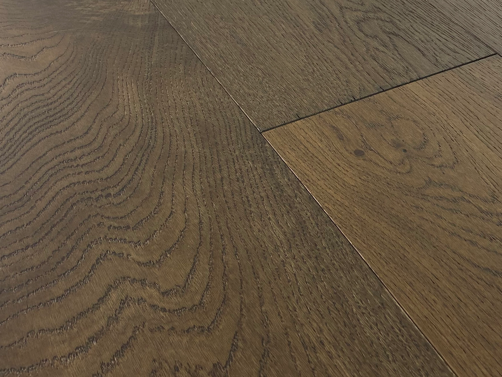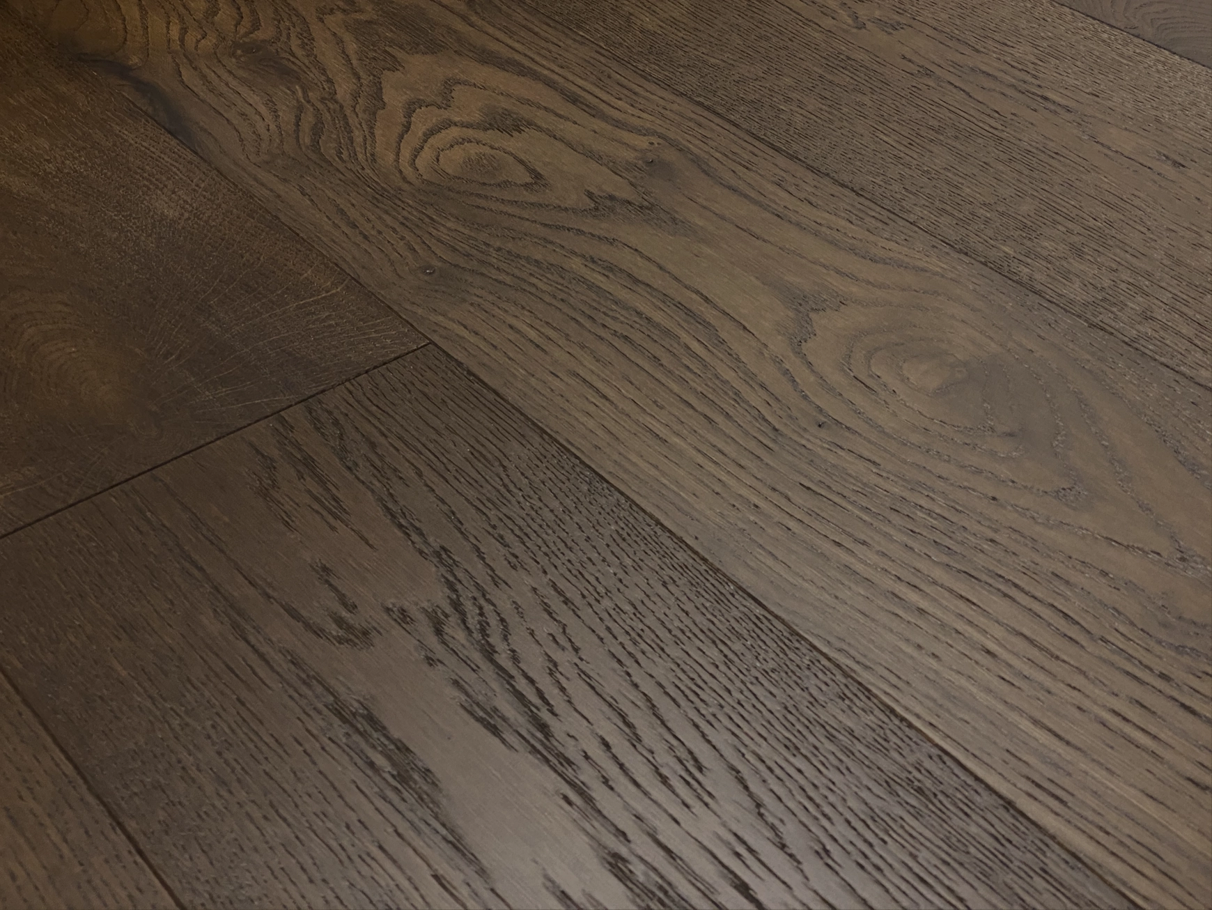 Tablea Degas is a dark smoked and wire brushed surfaced engineered hardwood flooring with a super wide planks.